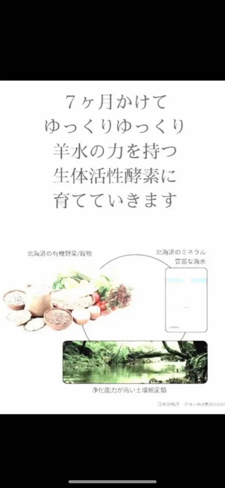 北海道の有機野菜や穀物と北海道のミネラル豊富な海水、浄化能力が高い土壌細菌類から作られた、生体活性酵素水「羊水のしずく」です。